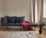 Sittdynorna är flyttbara och vändbara, och den mindre sittdynan har en tunn träbricka på ena sidan som fungerar som underlägg för din kaffekopp eller laptop. Ett litet sidobord går att integrera i soffan (finns att beställa som tillbehör).