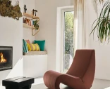Tyget Volo – här i färgen 69 Marron – är en fint vävd ullblandning med tydlig textur och elegant lyster. Den djupa bruna tonen ger fåtöljen en varm men distinkt karaktär. En designmöbel som talar sitt eget språk – utan att kompromissa med komforten.