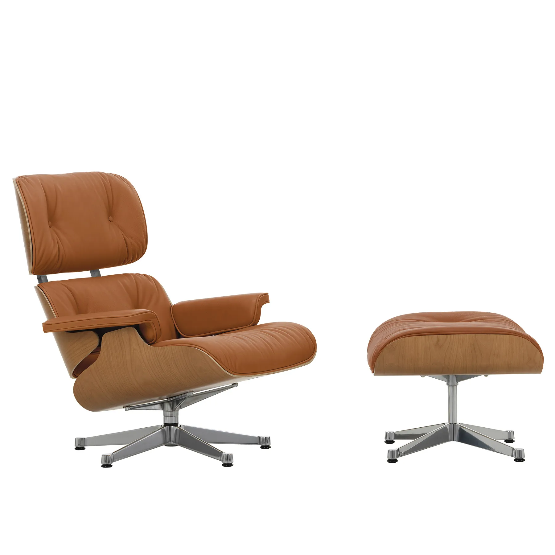 Vitra Eames Lounge Chair med fotpall i körsbärsfanér, klädd i Leather Premium F 97 Cognac och med polerad aluminiumbas. En ikon från 1956 där röda trätoner och cognacsfärgat läder möts i ett varmt och levande uttryck.