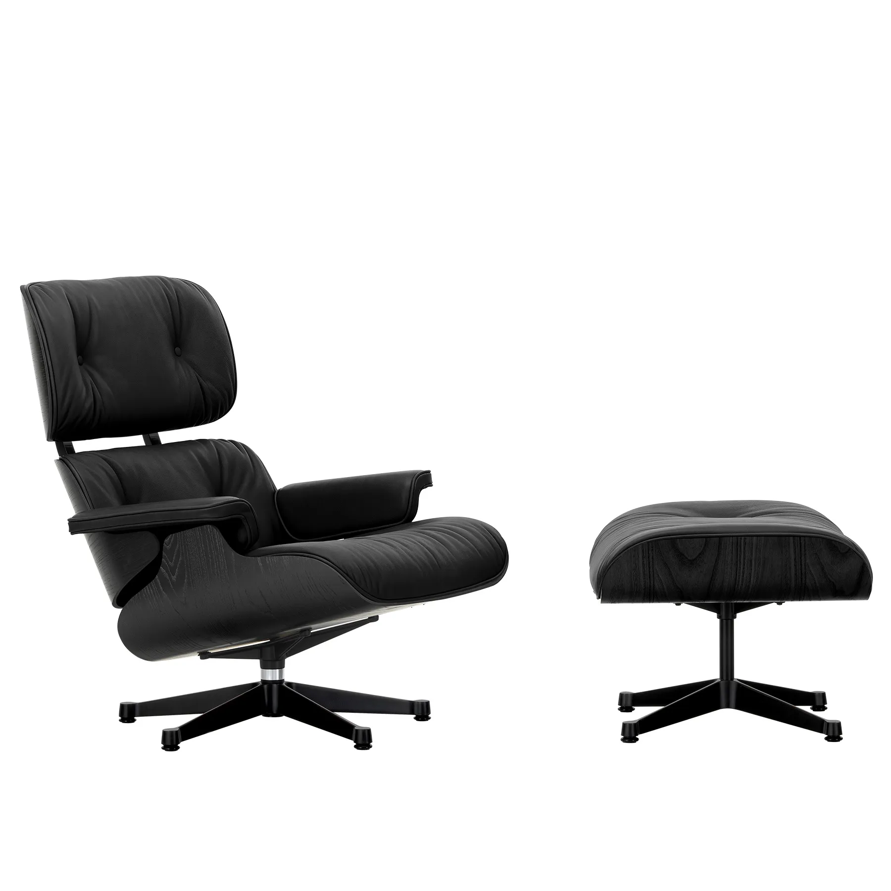 Vitra Eames Lounge Chair med fotpall i svartbetsad kastanjefanér, klädd i Leather Premium F 66 Nero och med polerad aluminiumbas. En ikon från 1956 i helsvart utförande – kraftfull, balanserad och tidlös.