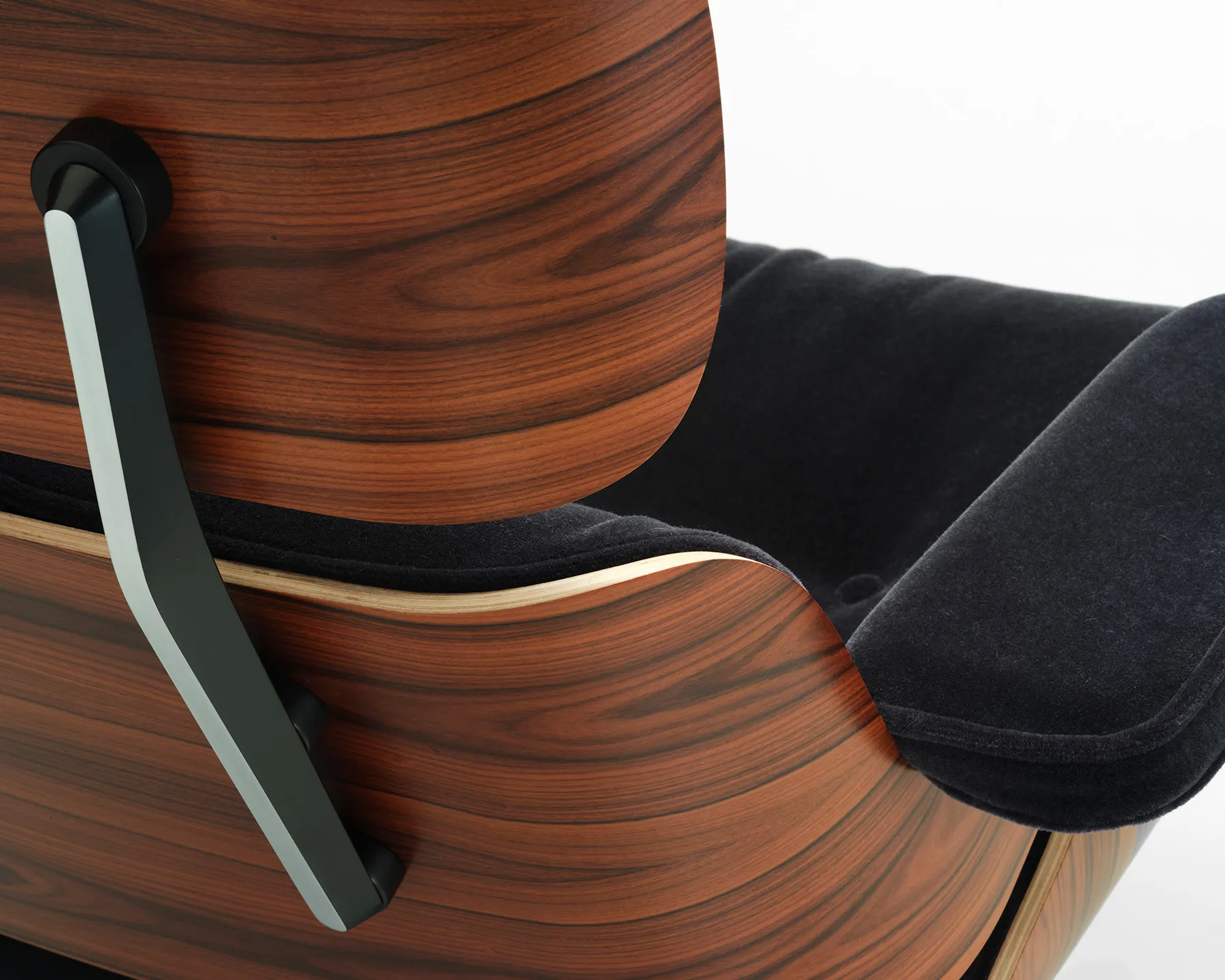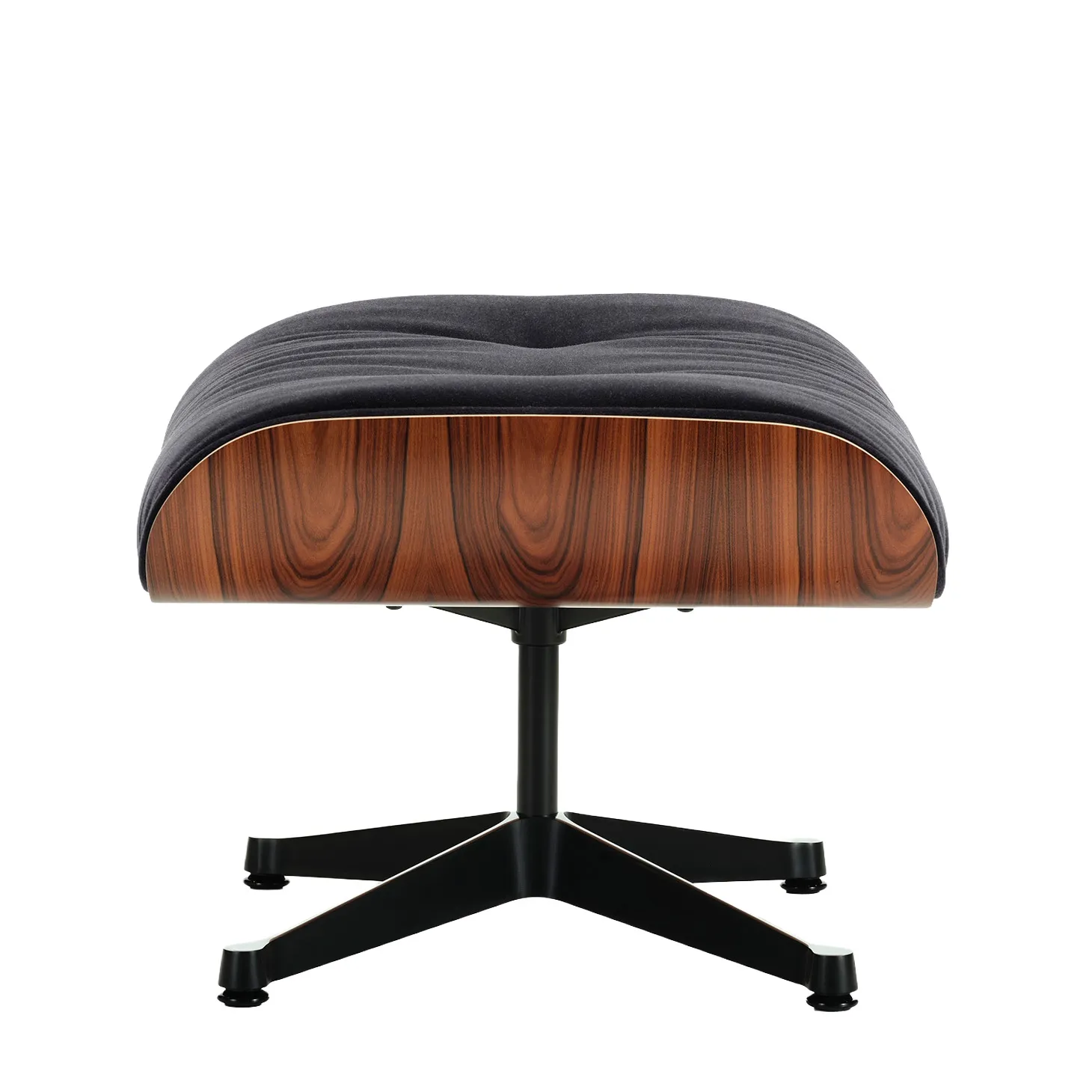 Vitra Eames Lounge Chair med fotpall i Santos Palisander, klädd i Calma 08 Dark Anthracite – ett sammetliknande tyg i mörk antracit – med svartlackad aluminiumbas. En ikon som kombinerar rik materialitet med avslappnad elegans.