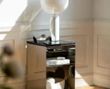 Här är sängbordet med skiva i marmor. Den svarta marmorskivan är särskilt utvald för att matcha Holme sängbord. Marmorskivans uttryck förstärks av en diskret ådring som är unik för varje exemplar. Marmorskivans dramatiska utseende bidrar till en lyxig helhet som perfekt matchar sängbordens moderna elegans.