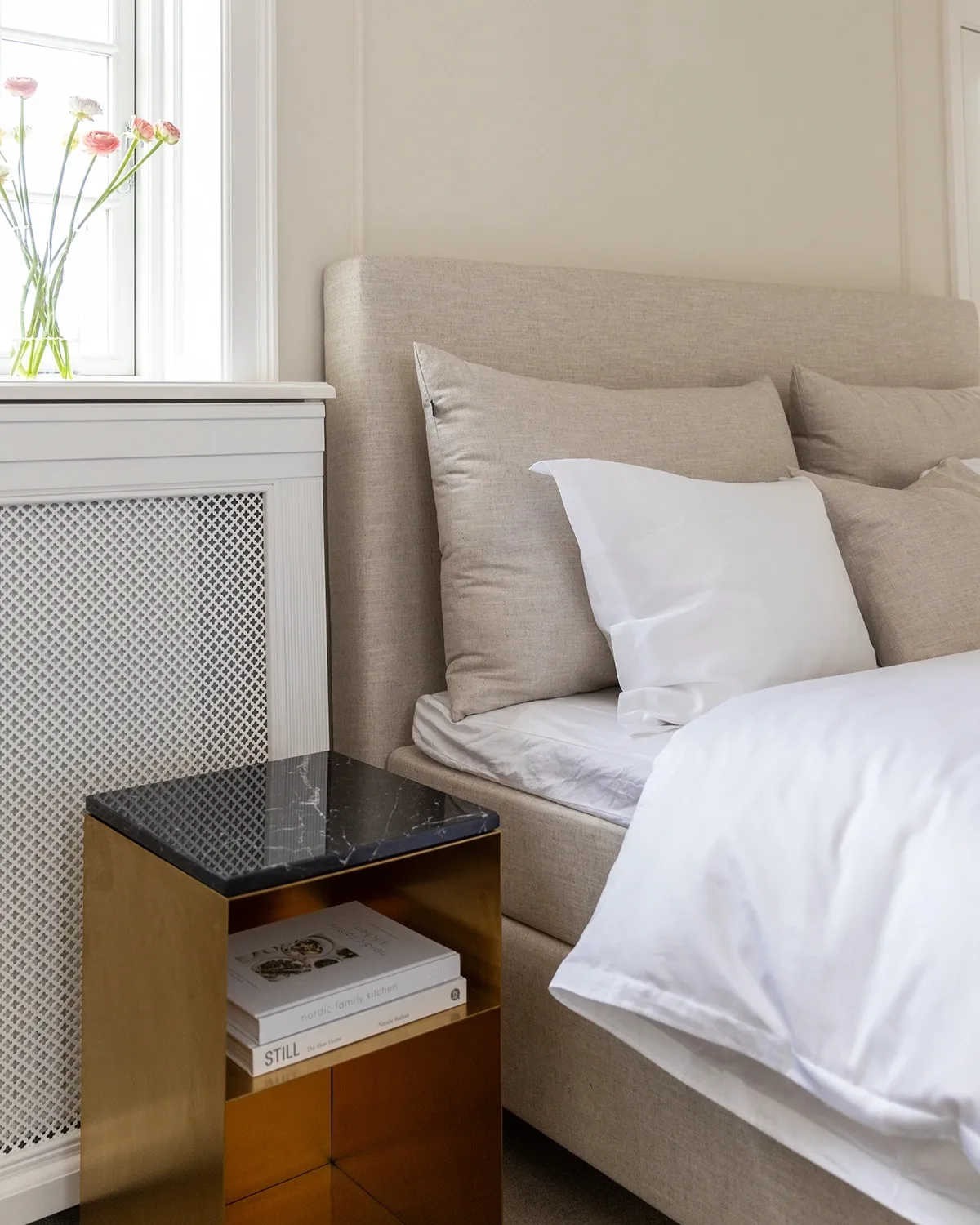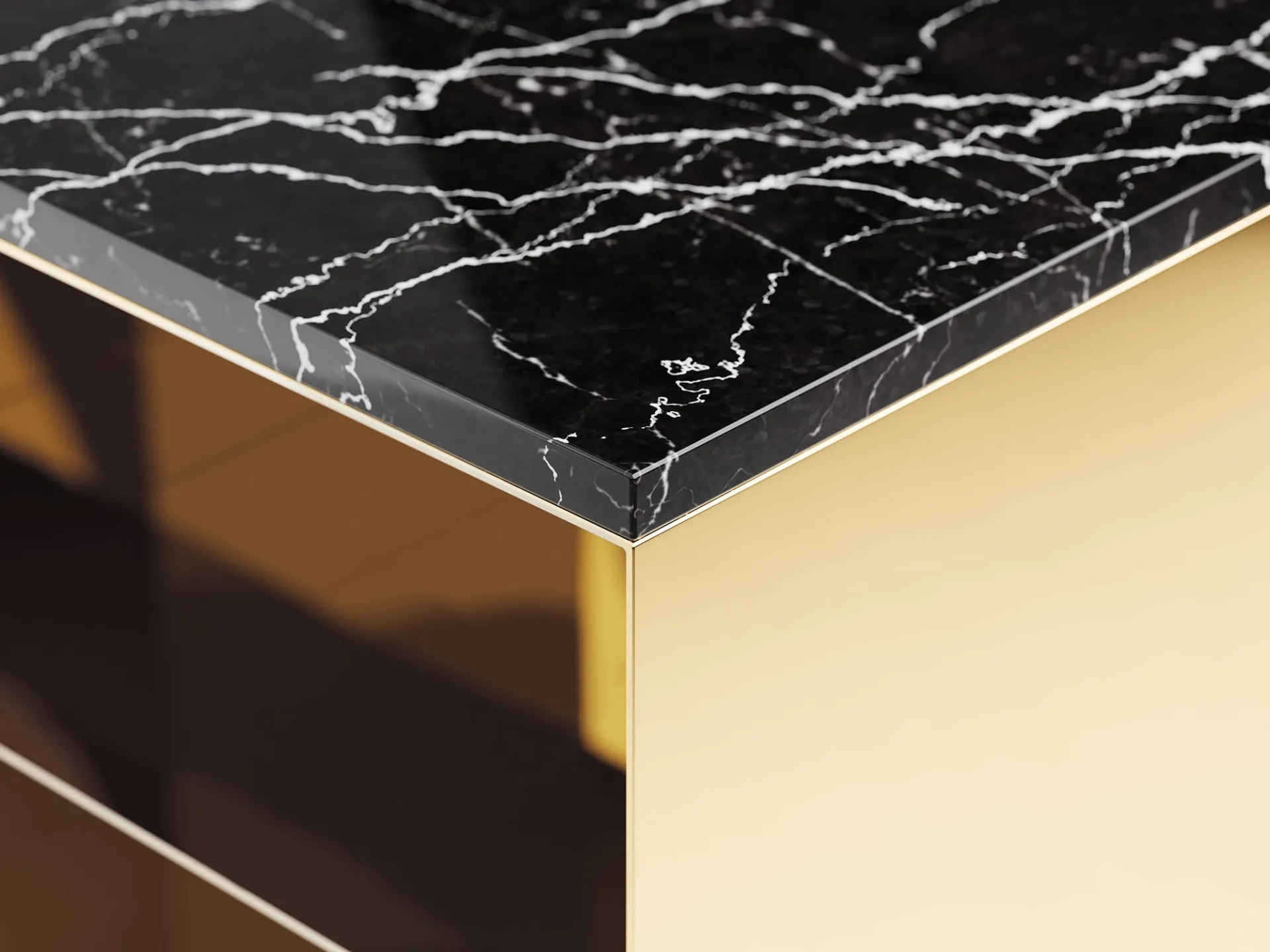 Den 20 millimeter tjocka marmorskivan är högglanspolerad för att skapa en vacker kontrast till sängborden.