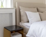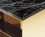 Här är sängbordet med skiva i marmor. Den svarta marmorskivan är särskilt utvald för att matcha Holme sängbord. Marmorskivans uttryck förstärks av en diskret ådring som är unik för varje exemplar. Marmorskivans dramatiska utseende bidrar till en lyxig helhet som perfekt matchar sängbordens moderna elegans.