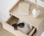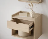 Hillmond sängbord/vägghylla från Rowico är tillverkat av ekfaner på MDF och har en tålig, lackad yta. Den passar lika bra som ett vägghängt skåp i hallen som ett sängbord i sovrummet. Eftersom den inte tar upp golvyta skapas ett öppnare intryck. Den praktiska lådan med mjukstängning ger plats för förvaring av småsaker som nycklar och accessoarer i hallen eller böcker och andra tillhörigheter vid sängen. Hillmond kombinerar funktion och stil, och kan matchas med andra möbler i Hillmond-serien för en harmonisk helhet.
