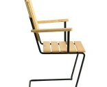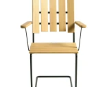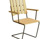 Den fjädrande konstruktionen skapas av ett stativ i massivt fjäderstål, vilket ger en mjuk och behaglig sittupplevelse. Fåtöljen finns i flera utföranden: oljad furu, oljad ek, grönmålad ek, vitmålad ek och obehandlad teak. Alla varianter med furu har ett grönt stativ, medan ek- och teakmodellerna finns med varmförzinkat eller svart stativ.