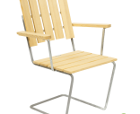 Den fjädrande konstruktionen skapas av ett stativ i massivt fjäderstål, vilket ger en mjuk och behaglig sittupplevelse. Fåtöljen finns i flera utföranden: oljad furu, oljad ek, grönmålad ek, vitmålad ek och obehandlad teak. Alla varianter med furu har ett grönt stativ, medan ek- och teakmodellerna finns med varmförzinkat eller svart stativ.
