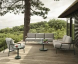 Settle 3-sitssoffa från Muuto är en elegant och rymlig utomhussoffa som förenar funktion och design. Den slitstarka stålkonstruktionen ger ett lätt och luftigt uttryck, medan armstöden i sapele-mahogny tillför en varm, naturlig känsla. Med vädertåliga dynor och generös sittyta blir den en självklar plats för avkoppling utomhus.