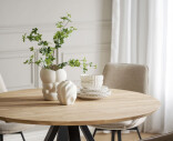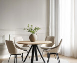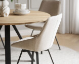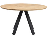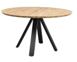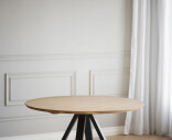 CARRADALE runt matbord i ek med tvådelad massiv bordsskiva med fasad kant och ben i svart pulverlackad metall.