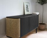 Treasures skänk i ek har rundade sidor klädda med rotting, textil eller konstläder, som öppnas som vingar och erbjuder förvaring för favoritböckerna eller -flaskorna. De tre dörrarna i mitten av skåpet gömmer rikligt med förvaringsutrymme.