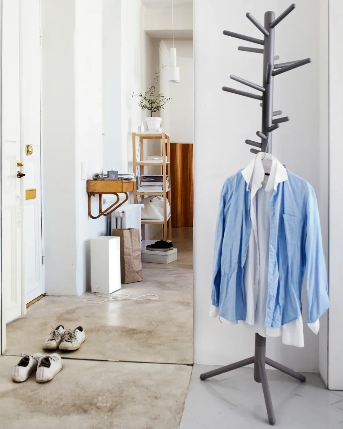Runko on valmistettu massiivikoivusta ja lepää vakaiden teräsjalkojen varassa. Koukut on sijoitettu eri korkeuksille – pidemmät ylemmäs ja lyhyemmät alemmaksi – mikä helpottaa takkien, laukkujen ja pienten asusteiden järjestämistä niin, etteivät ne ole toistensa tiellä. Muoto on suoralinjainen mutta pehmeä, ja siinä näkyy selkeästi luonnon muotokielen innoittama suunnittelu.