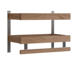 Hattuhylly kahdella hyllytasolla ja hiotun teräksen yksityiskohdilla. Ripustustangossa on upotettu pleksilista, joka suojaa puuta kulumiselta.