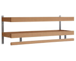 Hattuhylly kahdella hyllytasolla ja hiotun teräksen yksityiskohdilla. Ripustustangossa on upotettu pleksilista, joka suojaa puuta kulumiselta.