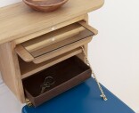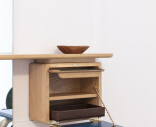 Materiaali: Massiivitammi, maalattu MDF, peililasi, messinginvärinen teräs, tummanruskea keinonahka