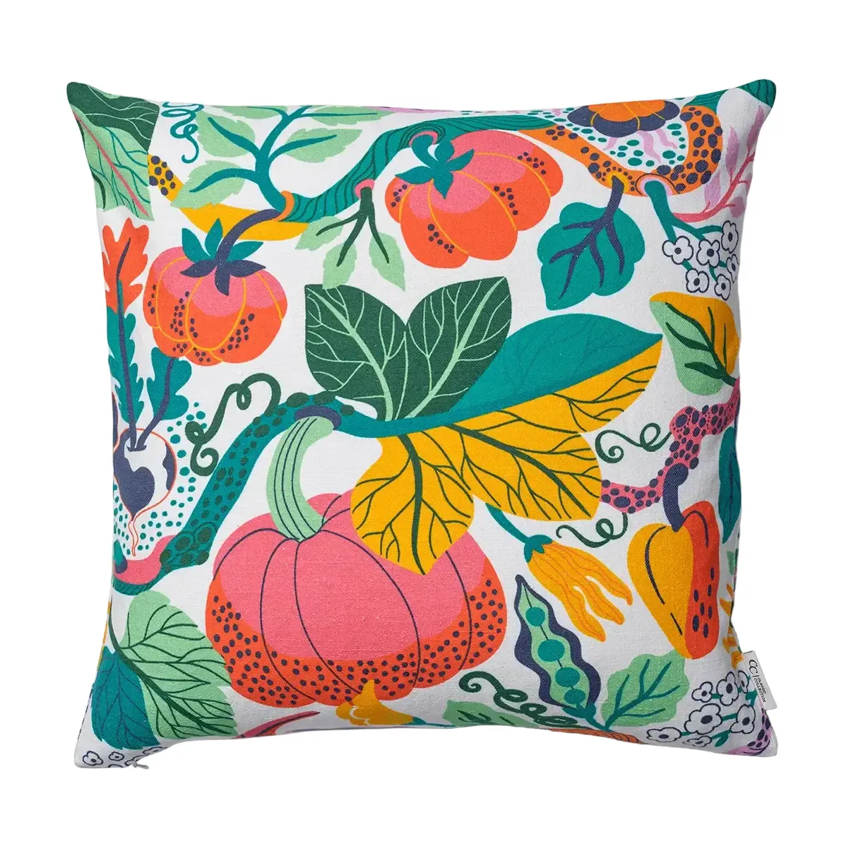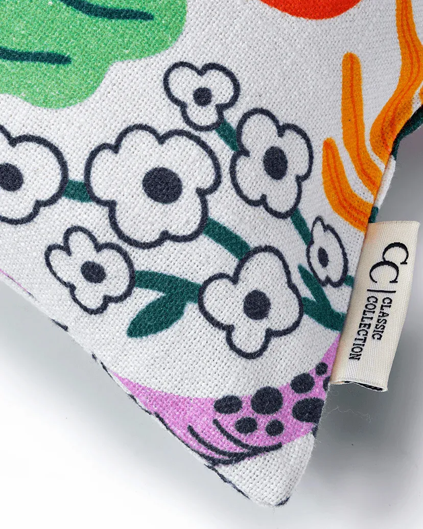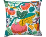 Heritage Garden on tyynynpäällinen, jossa on yksityiskohtainen kuviointi ja erilaisia kasviaiheita koko pinnalla. Värit vaihtelevat lämpimistä kirkkaisiin sävyihin, mikä tuo huoneeseen selkeän mutta tasapainoisen ilmeen.