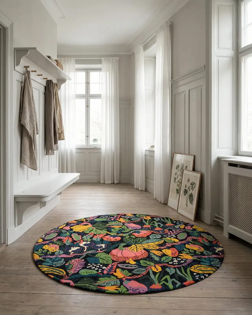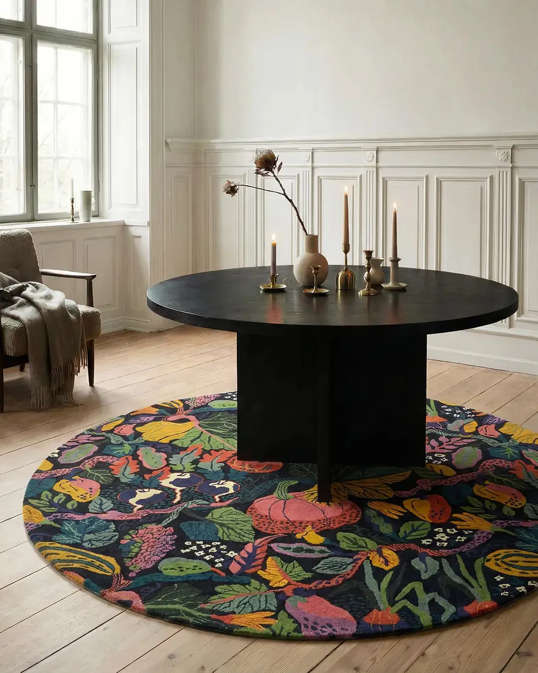 Heritage Gardenissa on yksityiskohtainen kuviointi, jossa hedelmät, lehdet ja orgaaniset muodot levittäytyvät koko pinnalle. Pyöreässä mallissa kuvio asettuu niin, että mattoon muodostuu selkeä keskipiste ja yhtenäisempi ilme.
