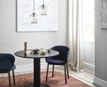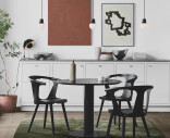 In Between SK11 on pienempi pyöreä ruokapöytä massiivipuisella kannella ja mustalla metallijalustalla. Design Sami Kallio.