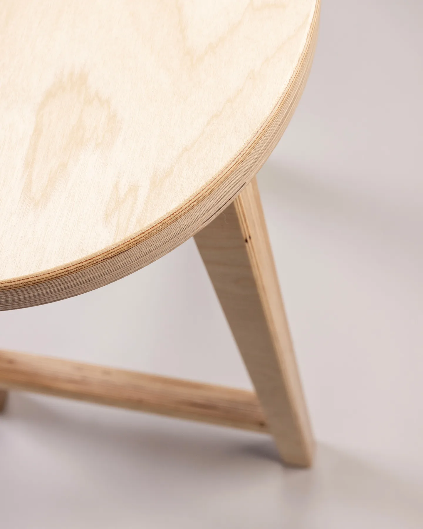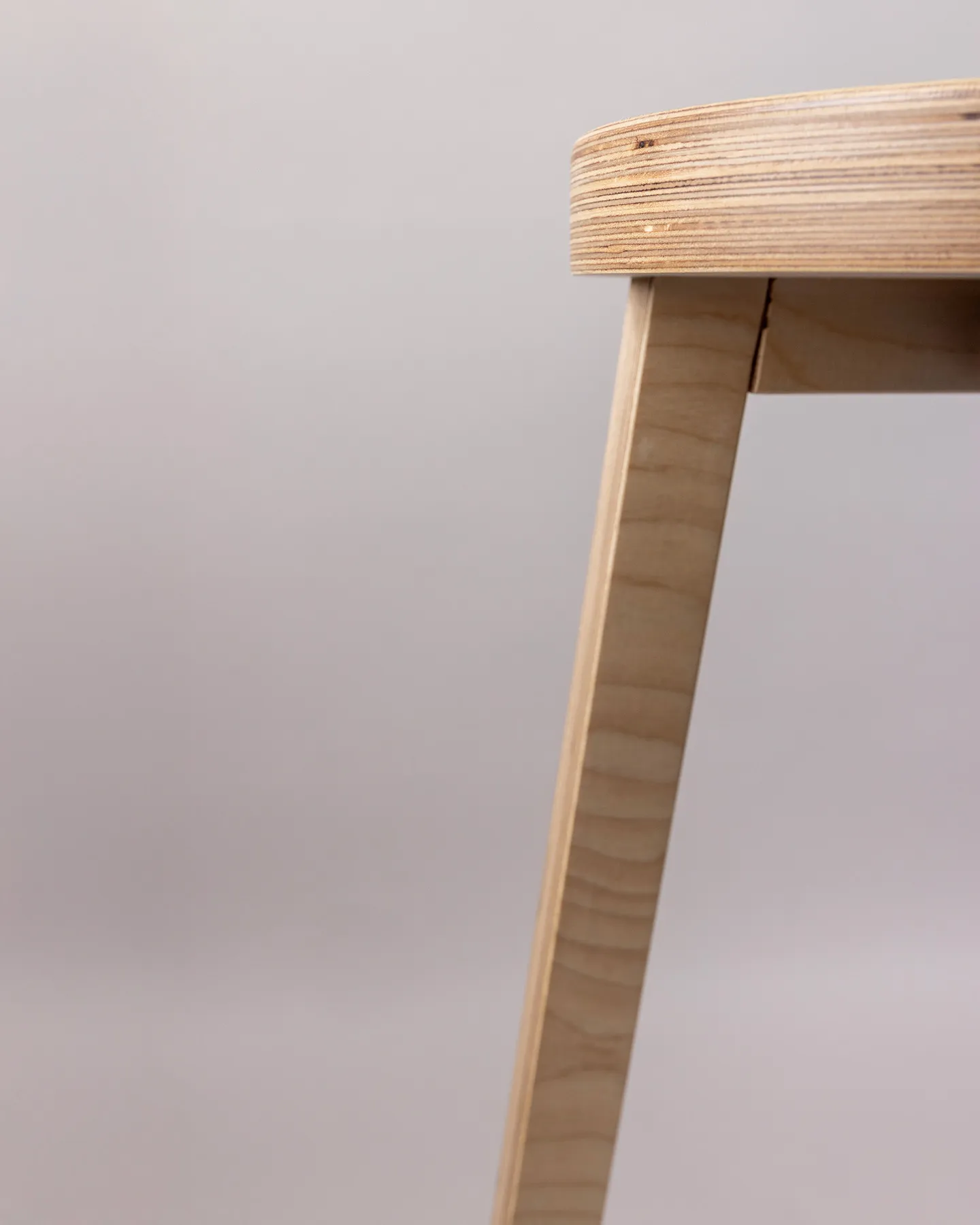Istuimen ja kaksi jalkaa valmistetaan koivuviilusta, joka hiotaan huolellisesti ja käsitellään ympäristöystävällisellä kovavahalla – korostamaan materiaalin luonnollista sävyä ja miellyttävää tuntua.