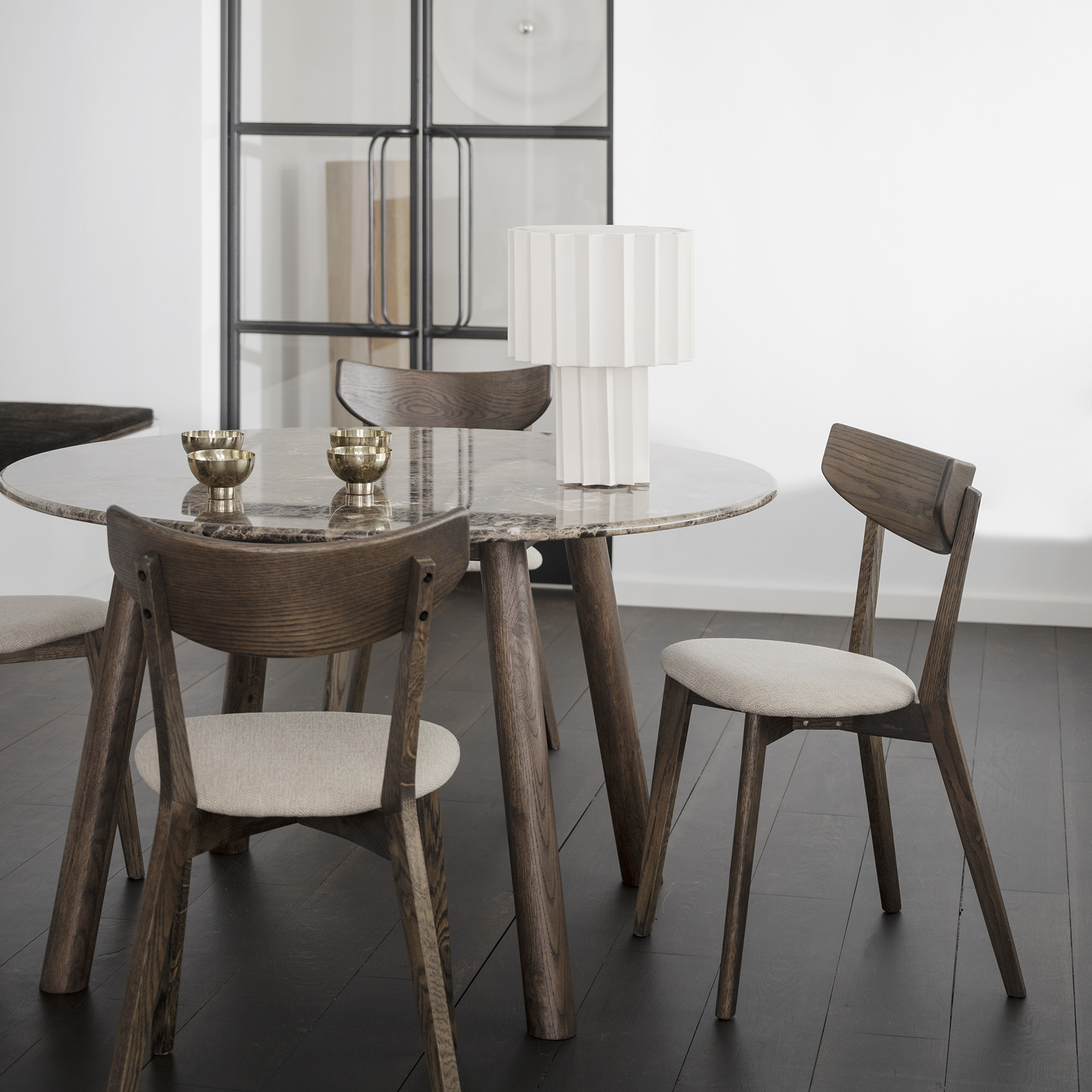 Taransay-ruokapöytä on ylellinen ja tyylikäs ruokapöytä, joka muodostaa kauniin keskipisteen kodissasi. Pöydässä on pyöreä Emperador-marmorikansi, jonka hienovaraiset variaatiot antavat pöydälle luonnollista kauneutta. Sen pehmeät muodot ja tyylikäs muotoilu tekevät jokaisesta huoneesta mielenkiintoisemman, missä ikinä se seisookaan. Kansi täydentyy valkopigmentoiduilla, FSC-sertifioidusta tammesta valmistetuilla massiivisilla jaloilla, jotka antavat pöydälle sekä vakautta että eleganssia.