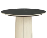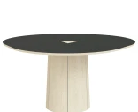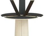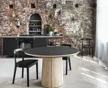 Pöytälevy on valmistettu mustasta nanolaminaatista, joka on sekä kestävä että helppohoitoinen. Valkoöljytystä tammiviilusta valmistettu jalusta luo lämpimän ja luonnollisen ilmeen. Patentoitu jatkomekanismi on tyylikkäästi integroitu ja säilyttää pöydän puhtaan, pyöreän muodon myös avattuna. Täydellinen sekä arki-illallisille että juhlavampiin hetkiin.