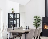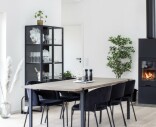 Harmaa petsattu tammi (viilutettu) ruokapöytä, mustat metallijalat.