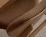 Runko on valmistettu massiivitammesta, ja istuin sekä selkänoja ovat muotoonpuristettua koivuvaneria tammiviilulla. Verhoiluna on Horizons – kestävä tekstiili, joka on valmistettu 100-prosenttisesti kierrätetystä polyesteristä. Pyöristetyt jalat, selkänojan pehmeät linjat ja tilava istuinosa muodostavat kokonaisuuden, jossa jokainen yksityiskohta on huolellisesti viimeistelty.