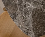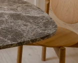 Pyöreä pöytälevy on valmistettu luonnollisesta marmorista tai travertiinista ja lepää tukevan, jauhemaalatusta teräksestä valmistetun jalan varassa. Jokainen kivilevy on yksilöllinen – elävä pintakuvio ja sävyvaihtelut antavat pöydälle persoonallisen ilmeen. Ajan myötä kivi kehittää kauniin patinan, joka heijastaa materiaalin aitoutta ja käyttöä.
