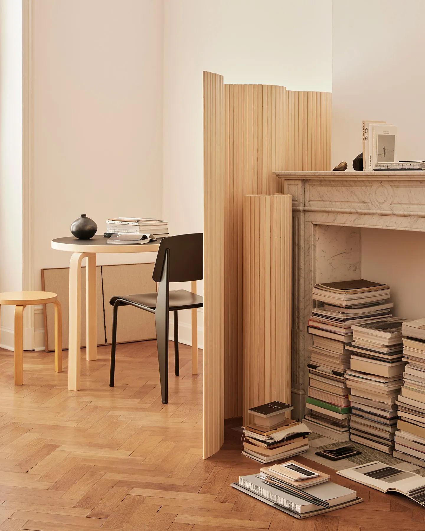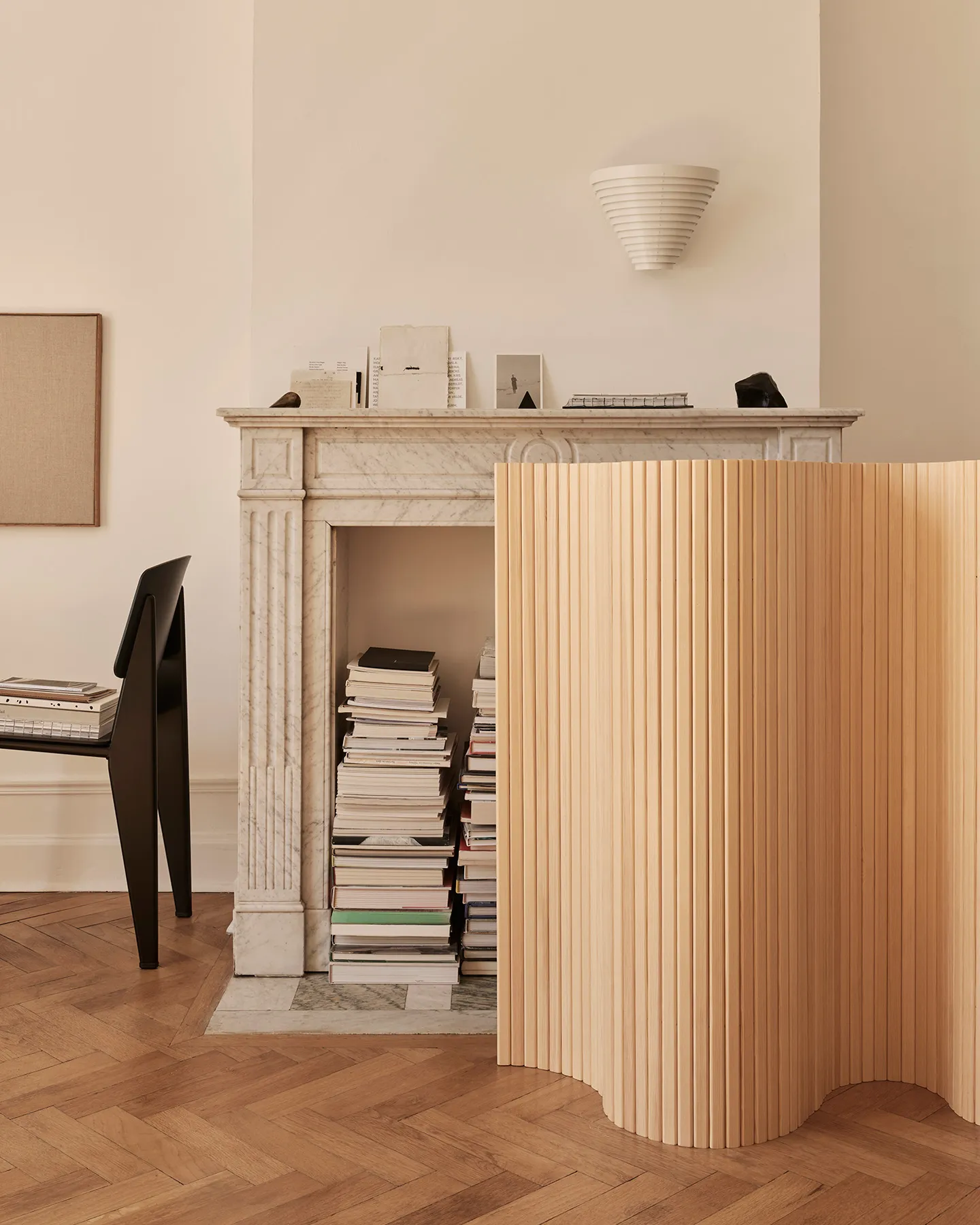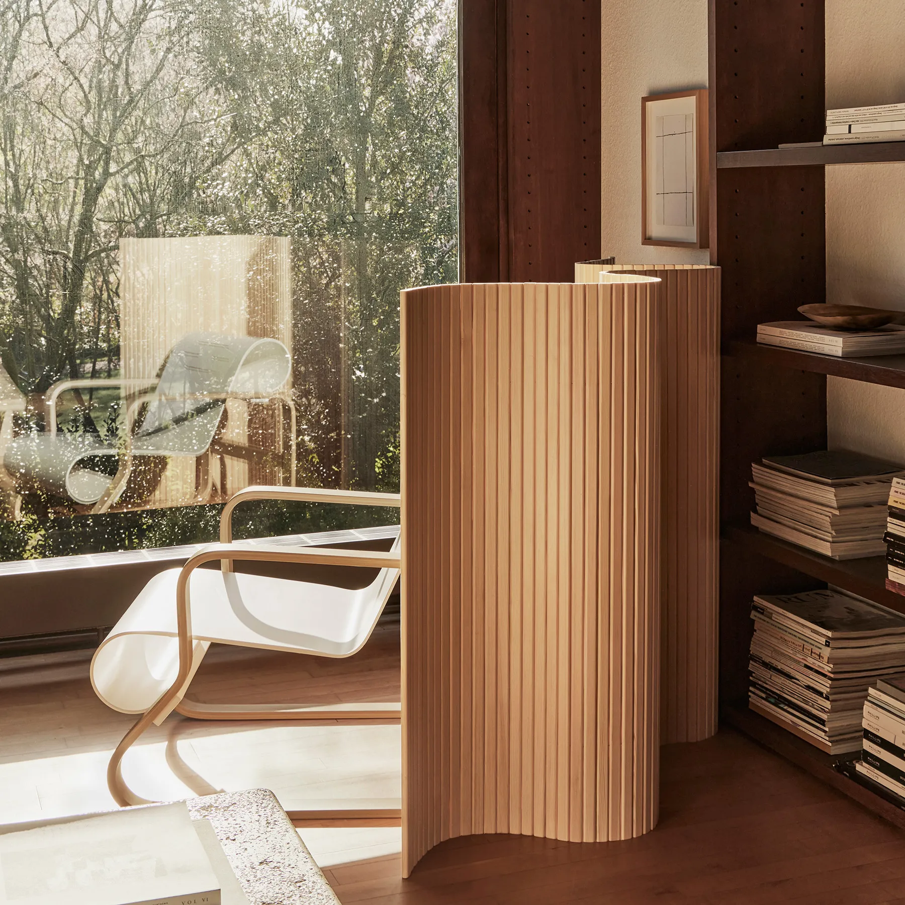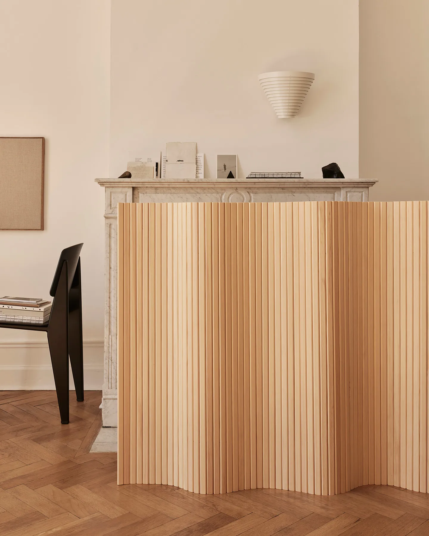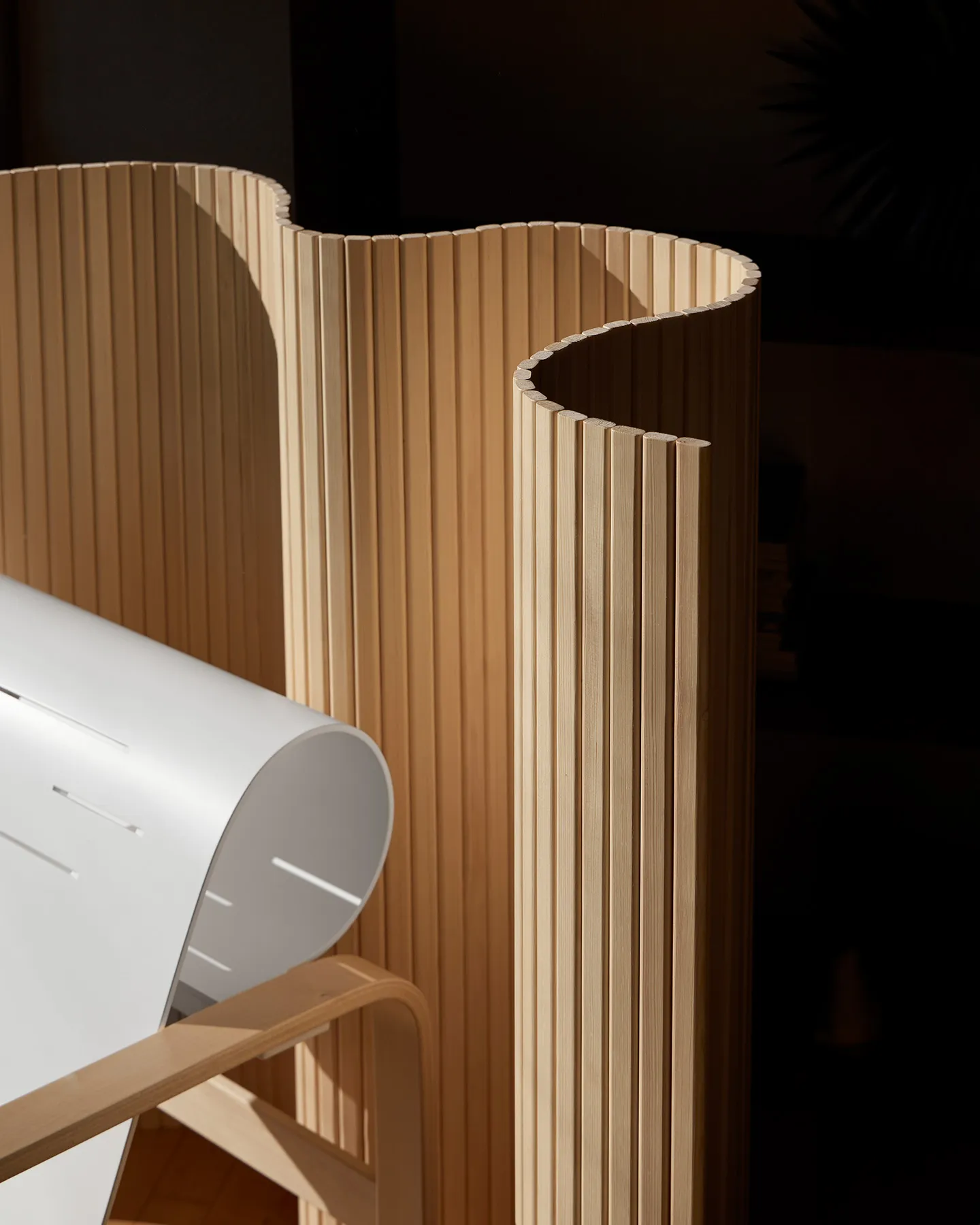Säleseinä kuuluu Alvar Aallon arkkitehtonisimpiin huonekaluihin. Sen pehmeästi kaartuva muoto tuo sisustukseen orgaanista rytmiä ja tarjoaa samalla käytännöllisen tilanrajauksen. Korkeus 130 cm tekee tästä mallista erityisen sopivan kotitoimistoon – se toimii näkösuojana työpisteelle, rajaajana sohvan takana tai auttaa jäsentämään oleskelutilaa.