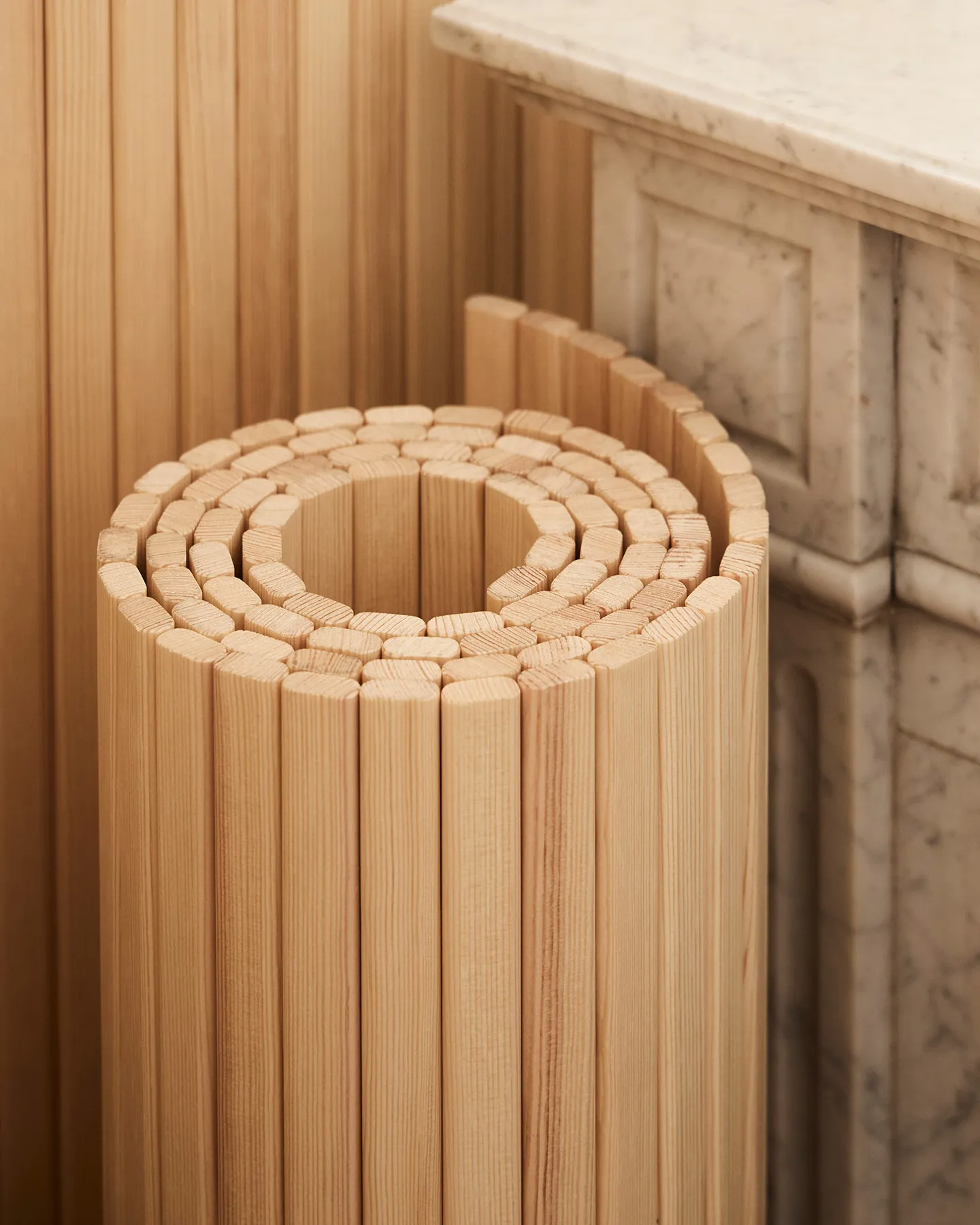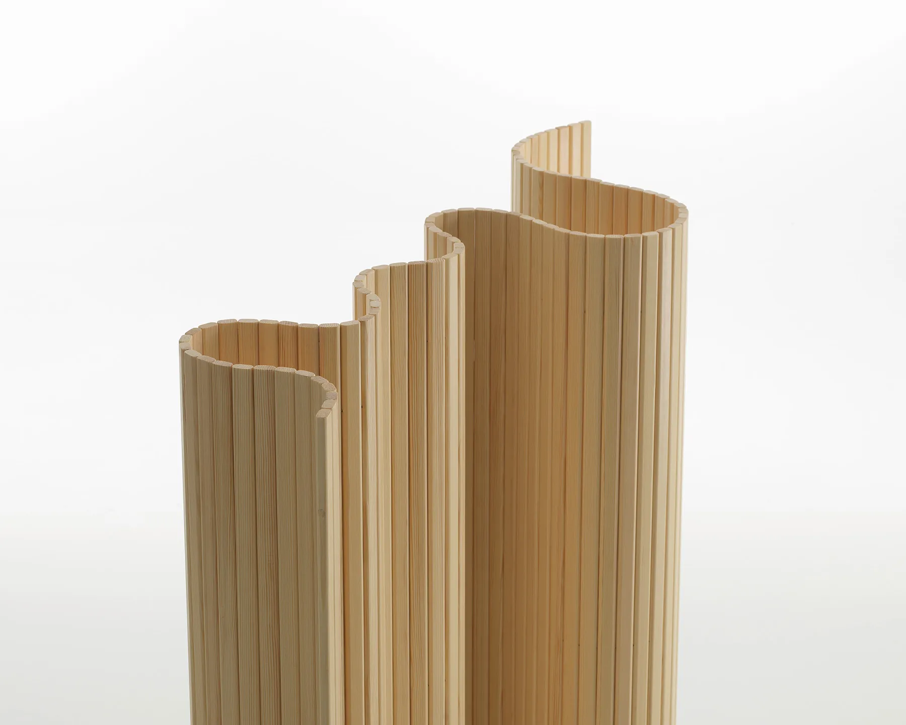 Säleseinä valmistetaan Suomessa lakatusta männystä, mikä erottaa sen monista Aallon muista huonekaluista, jotka on perinteisesti valmistettu koivusta. Mänty on elävä materiaali, joka patinoituu ajan myötä kauniisti ja tekee jokaisesta säleseinästä ainutlaatuisen. Kevyen rakenteensa ansiosta säleseinää on helppo siirtää, muotoilla ja rullata kokoon säilytystä varten – joustava valinta sekä koteihin että julkisiin tiloihin.