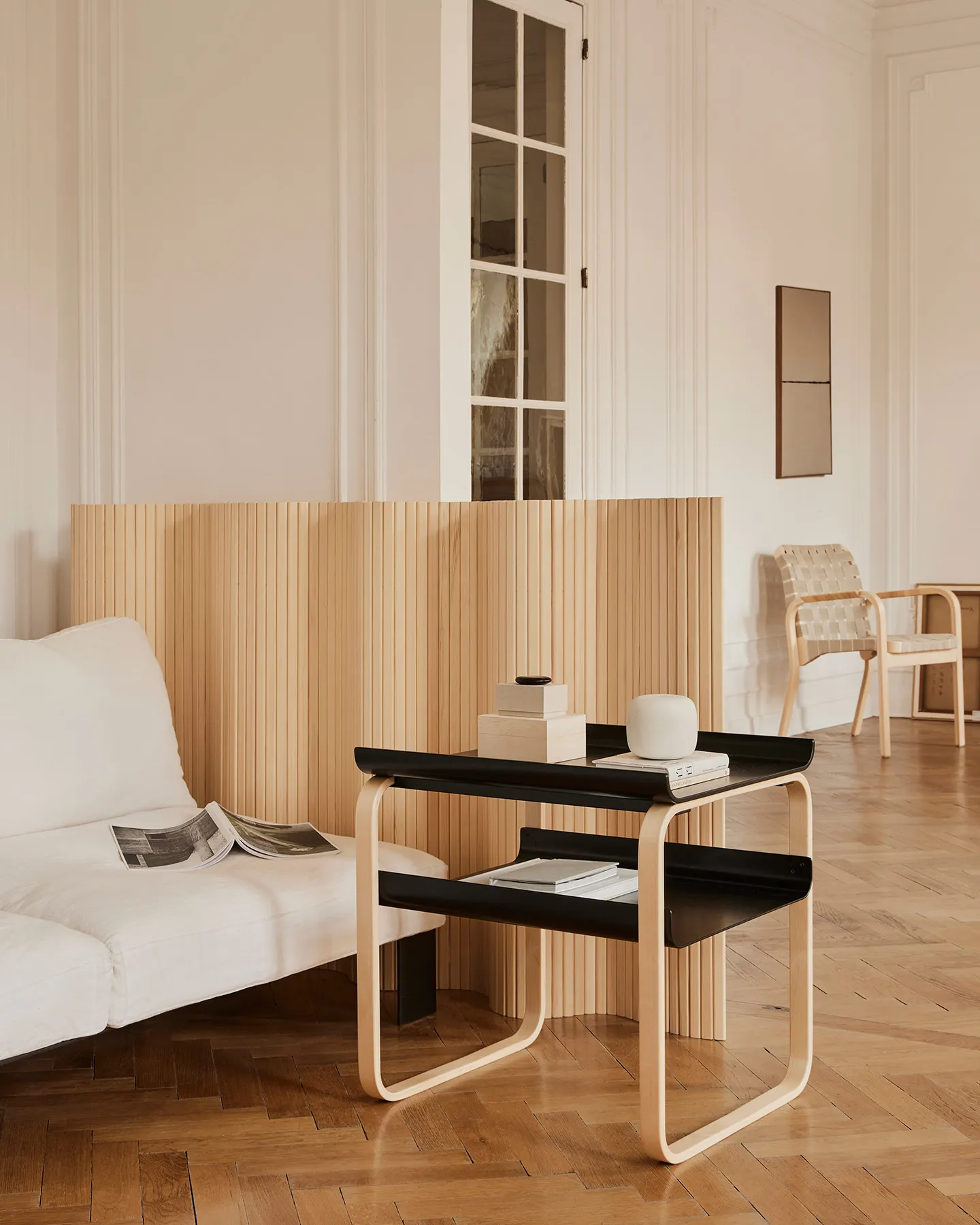 Säleseinä kuuluu Alvar Aallon arkkitehtonisimpiin huonekaluihin. Mallin matala, 100 cm korkeus tekee siitä erityisen sopivan hienovaraiseen tilanjakoon – se jäsentää tilaa häiritsemättä kokonaisuutta. Säleseinä toimii hyvin esimerkiksi oleskelutilan yhteydessä tai yhdessä nojatuolien kanssa, luoden kevyesti rajatun mutta avoimen tunnelman.