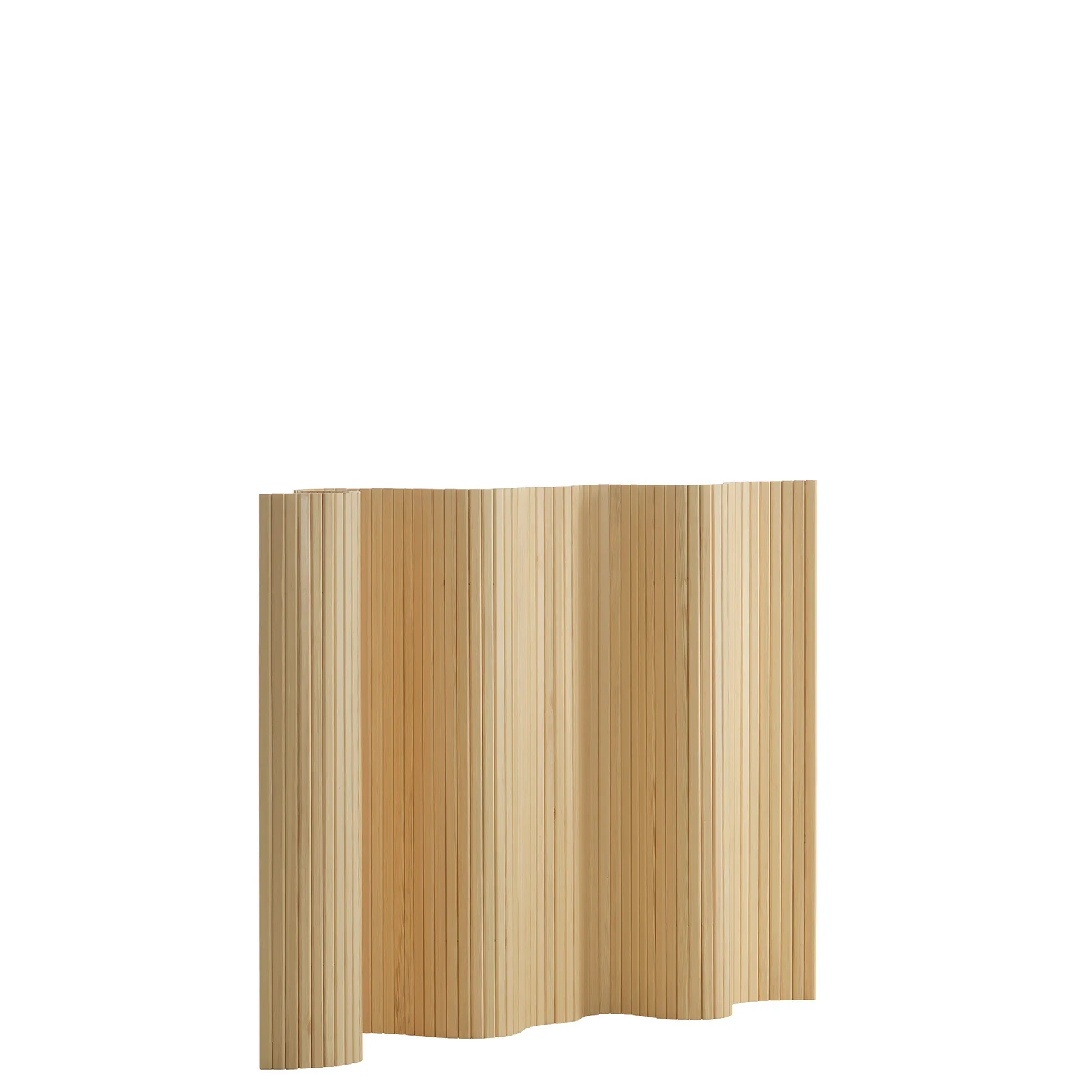 Säleseinä valmistetaan Suomessa lakatusta männystä. Se on kevyt ja muotoutuva, ja sitä on helppo siirtää, rullata kokoon ja sovittaa tilan mukaan. Mänty on elävä materiaali, jonka pinta patinoituu kauniisti ajan myötä – jokainen säleseinä on yksilöllinen. 100D on käytännöllinen valinta, kun tilaa halutaan jakaa hienovaraisesti mutta ilmeikkäästi.