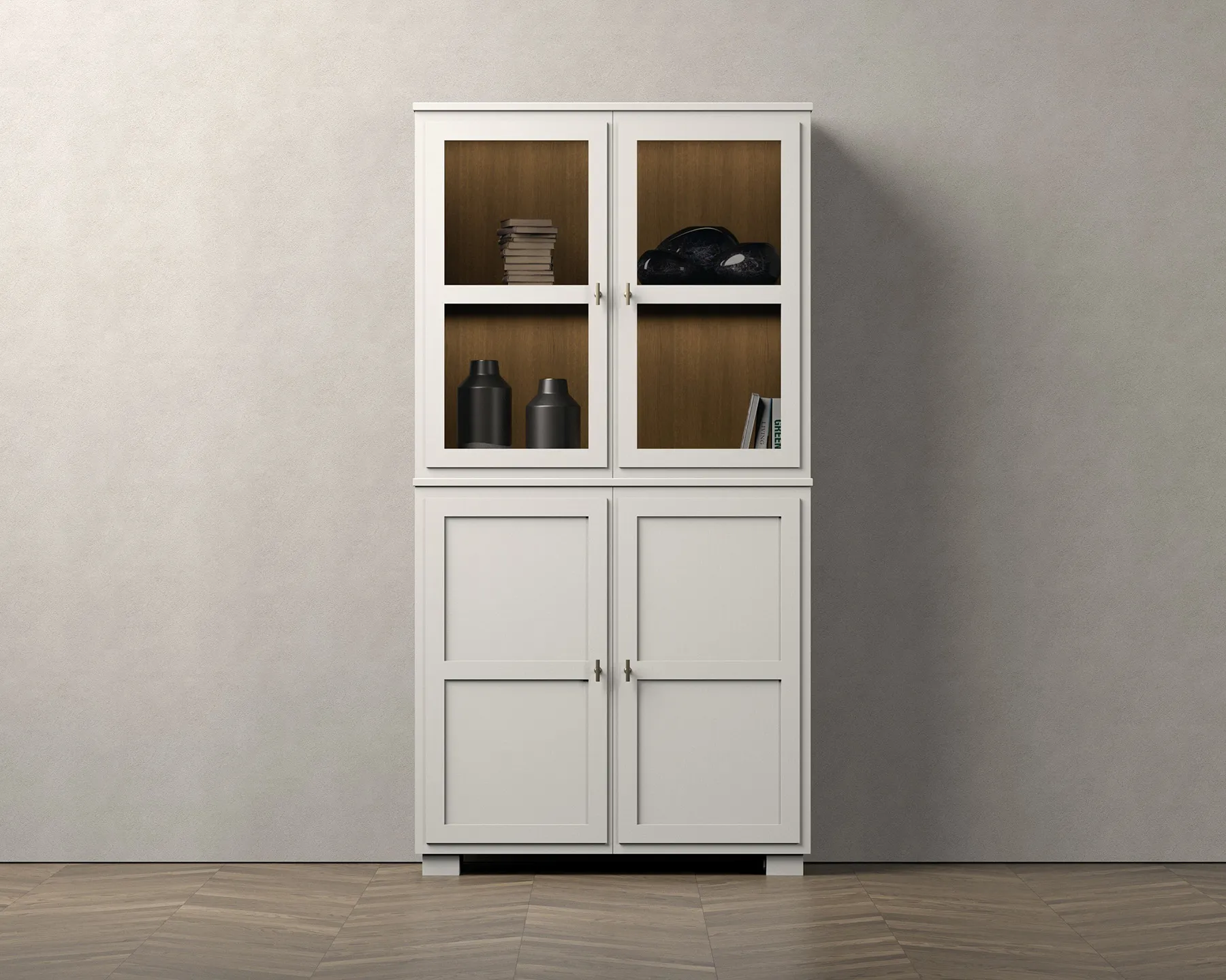 Camden vitriinikaappi 2+2 lasi-/puuovea, valaistuksella, yhdistää vitriinisäilytyksen ja suljetun säilytyksen samaan kalusteeseen. Kaappi on käsinmaalattu, siinä on petsatusta tammesta valmistettu taustalevy sekä käytännöllinen integroitu valaistus.