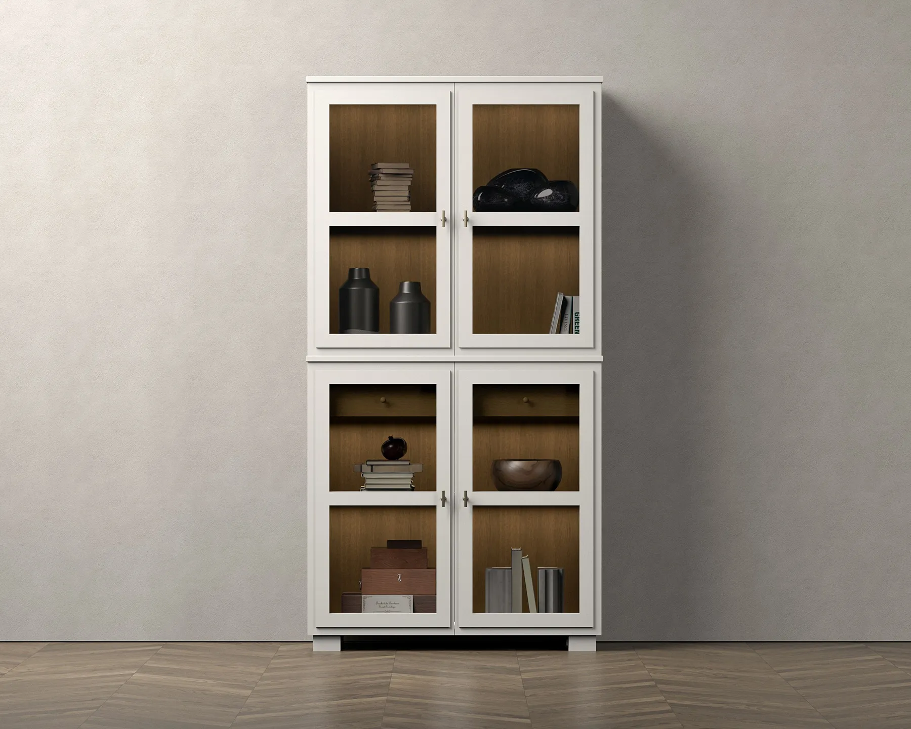 Camden vitriinikaappi 2+2 lasiovea, valaistuksella, koostuu kahdesta lasiovellisesta osasta, mikä luo avoimen ja selkeän kokonaisuuden, jossa sisältö on osa kalusteen ilmettä. Hyllytasot tarjoavat tilaa laseille, posliineille, tarjoiluyksityiskohdille tai muille esineille, jotka haluat säilyttää järjestyksessä mutta näkyvillä.