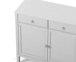 Kaappia voi käyttää itsenäisenä säilytyskalusteena tai yhdistää saman sarjan vitriinikaappiin, jolloin syntyy täydellinen ja tyylikäs säilytysratkaisu. Kolme laatikkoa tarjoavat paikan pienemmille tavaroille, kun taas ovien takana olevat hyllyt pitävät astiastot ja liinat siististi järjestyksessä.