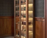 Kaapissa on viisi hyllytasoa ja integroidut LED-listat, jotka on huomaamattomasti sijoitettu jokaisen hyllyn yläpuolelle. Valaistus on himmennettävä ja sitä ohjataan helposti kaukosäätimellä – täydellinen ratkaisu, kun haluat säätää valon määrää luonnonvalon tai huoneen tunnelman mukaan.