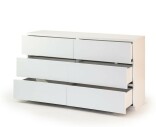 Jokaisessa laatikossa on piilotetut kuulalaakeroidut kiskot ja pehmeä sulkeutumismekanismi (soft-close), jotka tekevät päivittäisestä käytöstä hiljaista ja miellyttävää. Molemmat laatikostot seisovat omilla 5 cm korkeilla valkoisilla sokkeleillaan, mikä luo tasapainoisen ja kevyesti kohotetun vaikutelman. Kalusteen kokonaiskorkeus on 87,5 cm, mikä tekee siitä sopivan myös laskutasoksi olohuoneessa tai eteisessä.