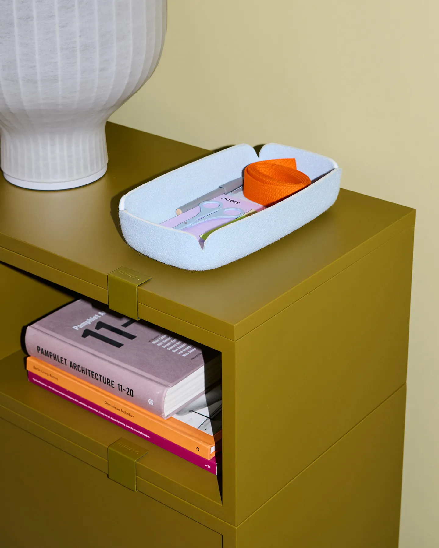 Säilytysratkaisu seisoo matalalla sokkelilla, joka luo vakaan vaikutelman ja kokoaa kokonaisuuden visuaalisesti lattiaan. Moduulit on valmistettu lakatusta MDF-levystä tai viilupinnasta ja ne yhdistetään Muuton tunnusomaisilla kiinnitysklipsuilla, jotka tuovat rakenteellista tukea ja ovat samalla osa kalusteen muotokieltä. Järjestelmä on kehitetty siten, että sitä voi helposti muokata, laajentaa tai sovittaa uudelleen tarpeiden muuttuessa.