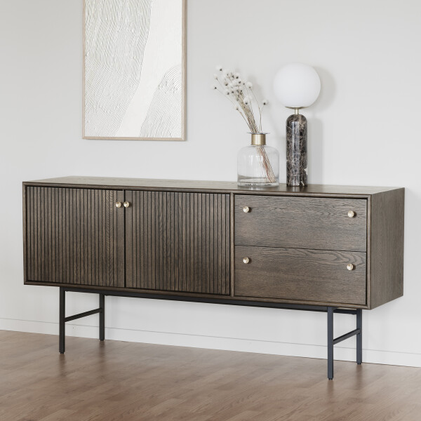 Clearbrook senkki ruskeaa tammea mustilla metallijaloilla. Ovissa on koristeellinen uurrettu kuvio ja messinkiset nupit, jotka antavat senkille arvokkaan ilmeen. Ovien sisäpuolella on yksi siirrettävä hyllylevy, ja sivulla kaksi käytännöllistä laatikkoa.