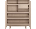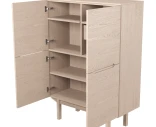 Kaapissa on neljä ovea, useita erikokoisia hyllyjä sekä ulosvedettävä laatikko pienille esineille. Upotetut puiset vetimet on integroitu etusarjaan, ja ne tarjoavat tyylikkään ja käytännöllisen ratkaisun, jossa mikään ei ulotu ulos. Siro alarakenne antaa kaapille ilmavan ilmeen ja tekee siitä helposti sijoitettavan eri huoneisiin.