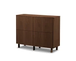 Kaappi seisoo kuuden kapean trapetsimuotoisen massiivipuisen jalan päällä, mikä antaa vakaan perustan ja kevyen ilmeen. Mielenkiintoinen yksityiskohta on illuusio neljästa pienemmästä ovesta, jotka ovat itse asiassa kaksi ovea, joista jokaisessa on hieno veistetty linja poikittain. Tämä korostaa käsityötaitoa sekä luonnonmateriaalin käyttöä.