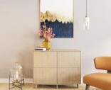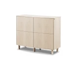 Kaappi seisoo kuuden kapean trapetsimuotoisen massiivipuisen jalan päällä, mikä antaa vakaan perustan ja kevyen ilmeen. Mielenkiintoinen yksityiskohta on illuusio neljästa pienemmästä ovesta, jotka ovat itse asiassa kaksi ovea, joista jokaisessa on hieno veistetty linja poikittain. Tämä korostaa käsityötaitoa sekä luonnonmateriaalin käyttöä.