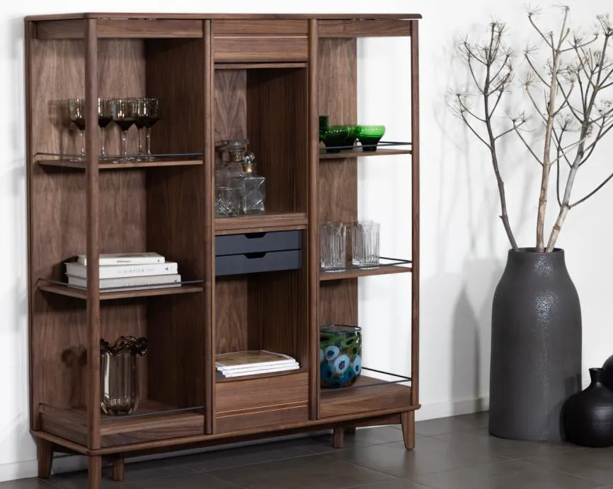 Skovby #546 Dual Furn Cabinet on innovatiivinen kaappi, jossa on ainutlaatuinen 180 asteen pyöräytysmekanismi, joka mahdollistaa sisällön helpon saavutettavuuden. Kaappi on valmistettu pähkinäpuusta ja yhdistää korkealaatuisen käsityön ja älykkään suunnittelun. Sisäänrakennetun LED-valaistuksen ansiosta, joka aktivoidaan kosketustoiminnolla, se tarjoaa tyylikkään ja käytännöllisen säilytysratkaisun, joka nostaa toiminnallisuuden uudelle tasolle.