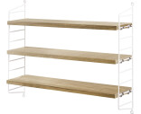 String Pocket seinähylly sisältäen valkoiset sivupaneelit ja hyllylevyt tammea.