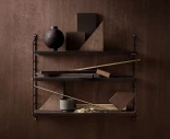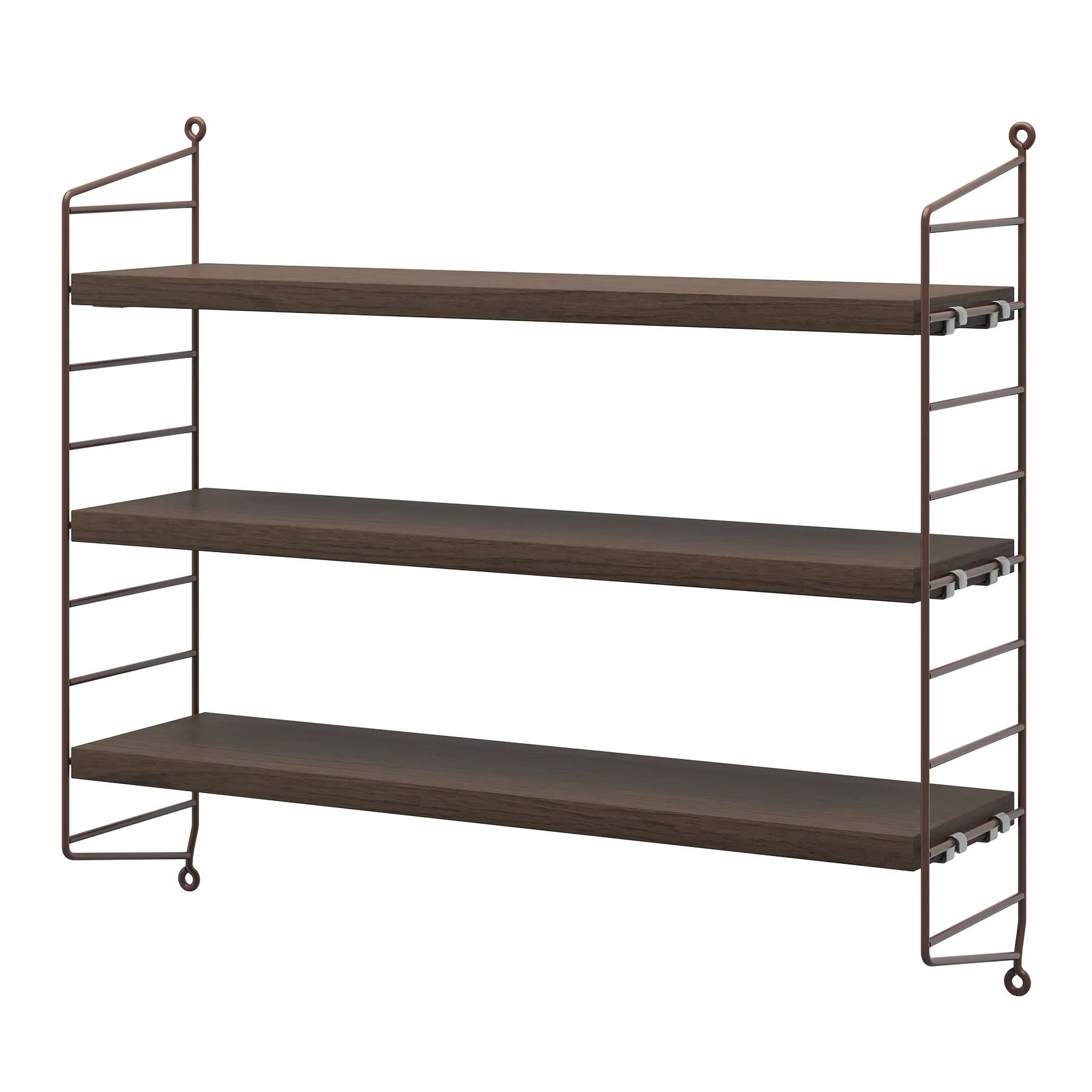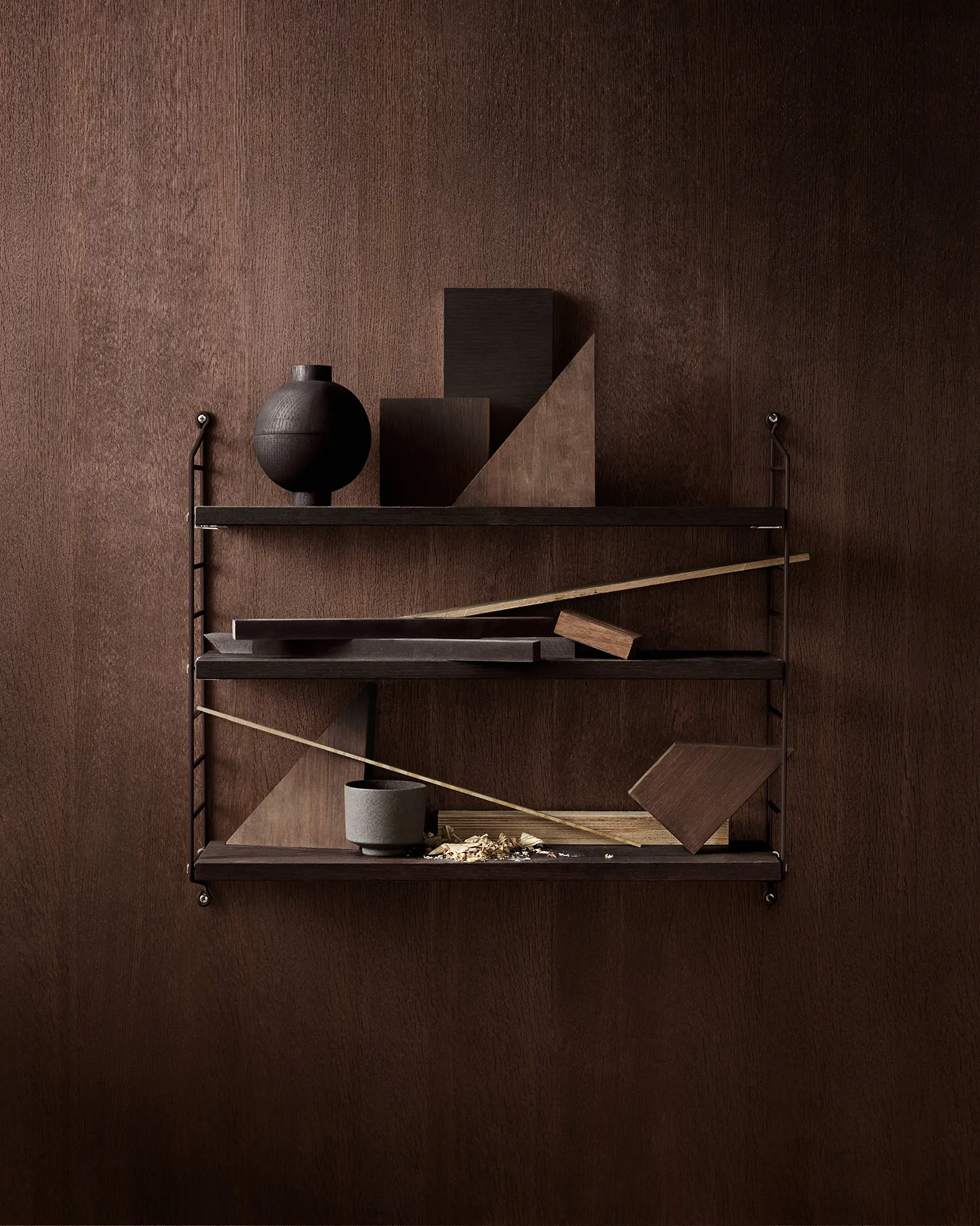 String Pocket seinähylly sisältäen tummanruskeat sivupaneelit ja tummat tammiset hyllylevyt.