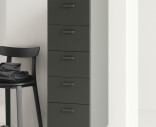 Korkea Relief-laatikosto viidellä vetolaatikolla, jaloilla.