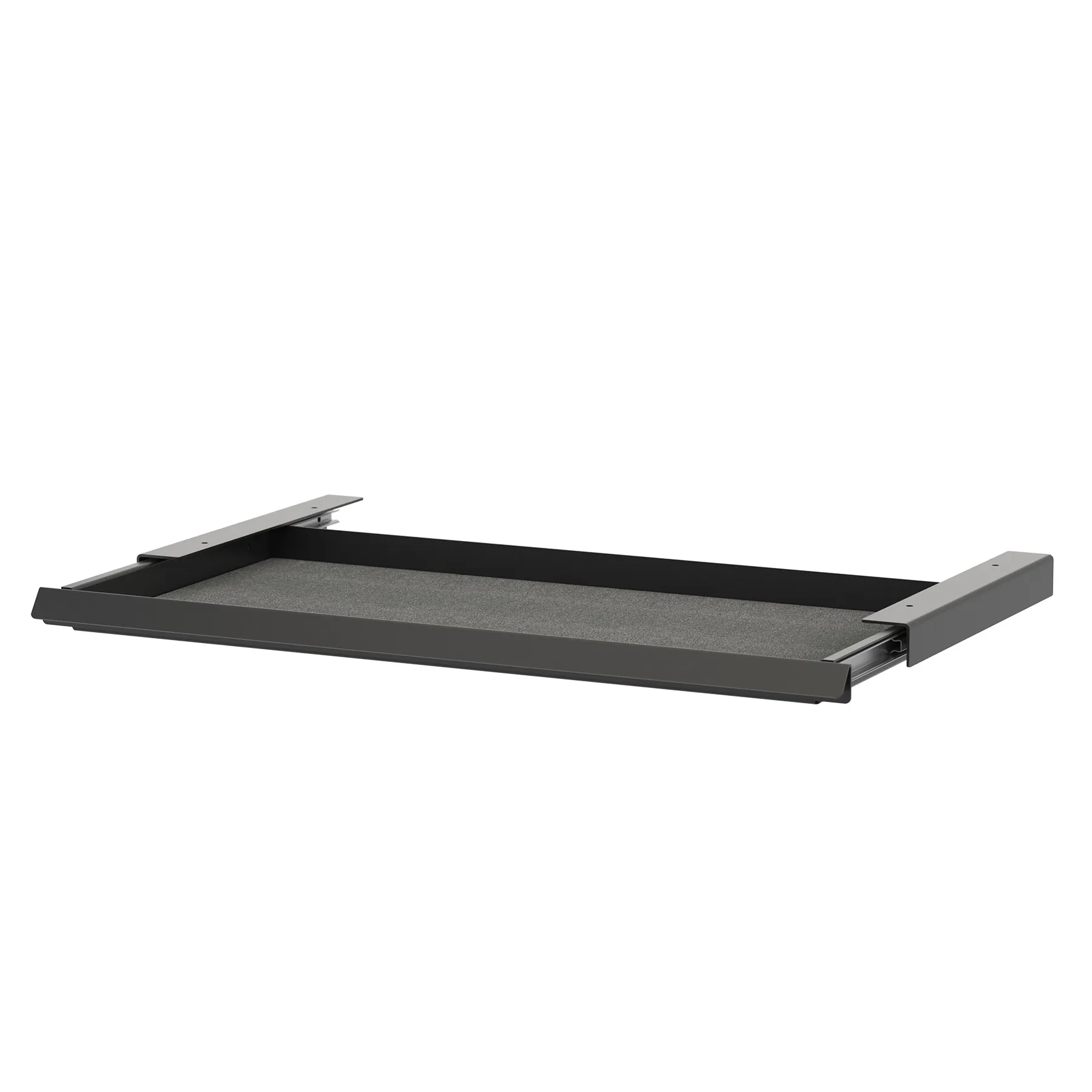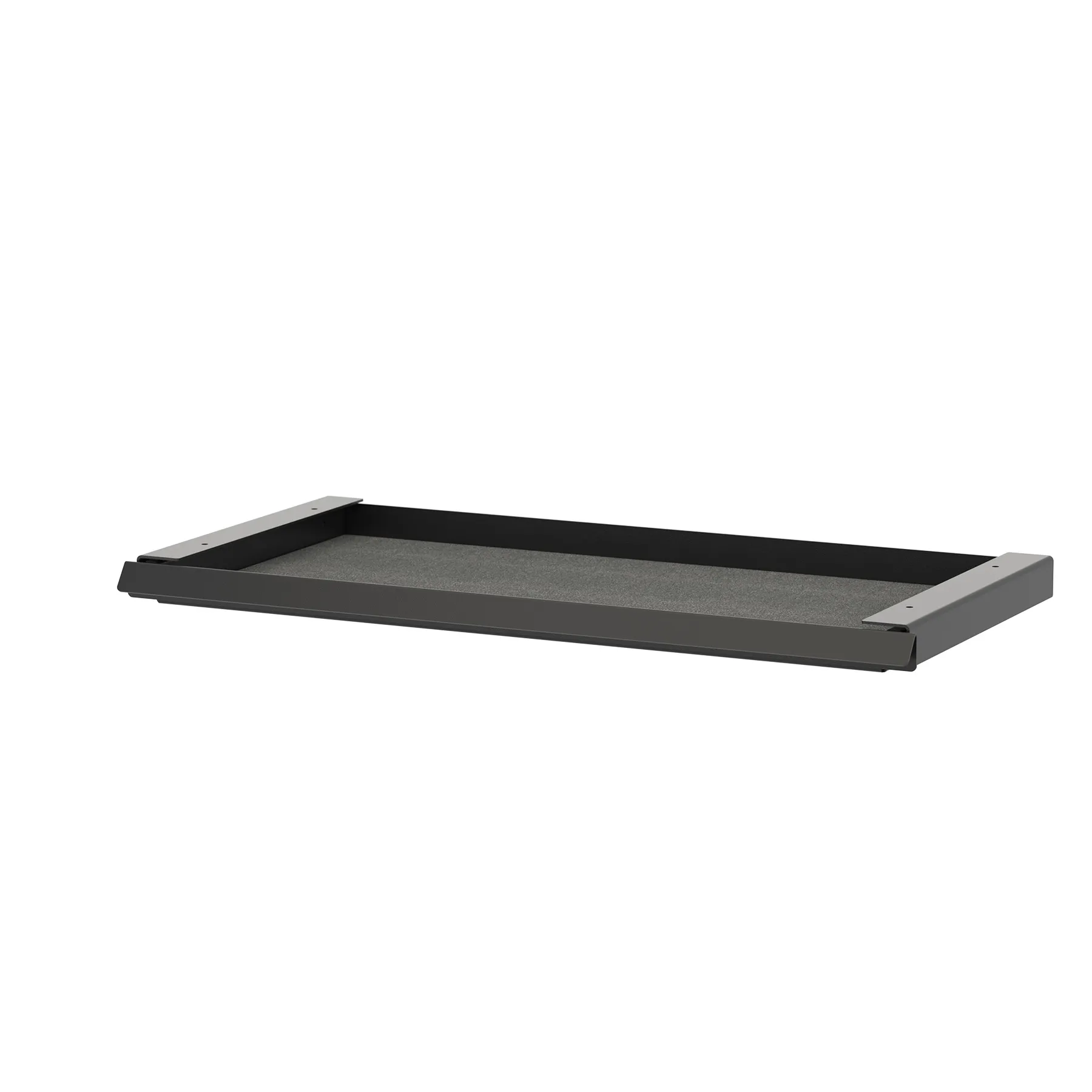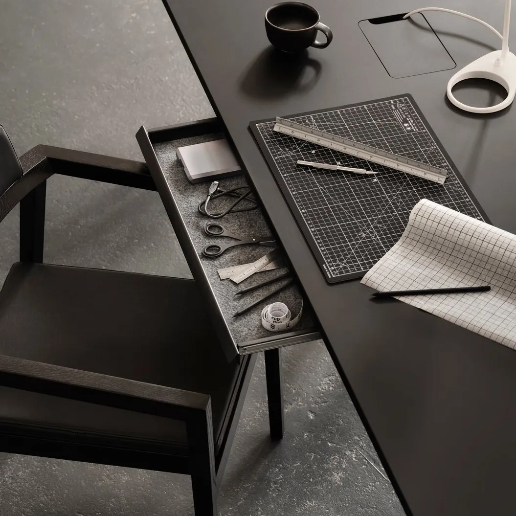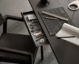 Laatikko liukuu pehmeästi kiskoilla ja sen sisäpinta on verhoiltu suojaavalla huopamatolla, joka sopii pienten toimistotarvikkeiden, kaapeleiden tai henkilökohtaisten tavaroiden säilyttämiseen. Matala rakenne tekee Desk Drawerista huomaamattoman osan kokonaisuutta – se tukee selkeämpää ja pelkistetympää työympäristöä.