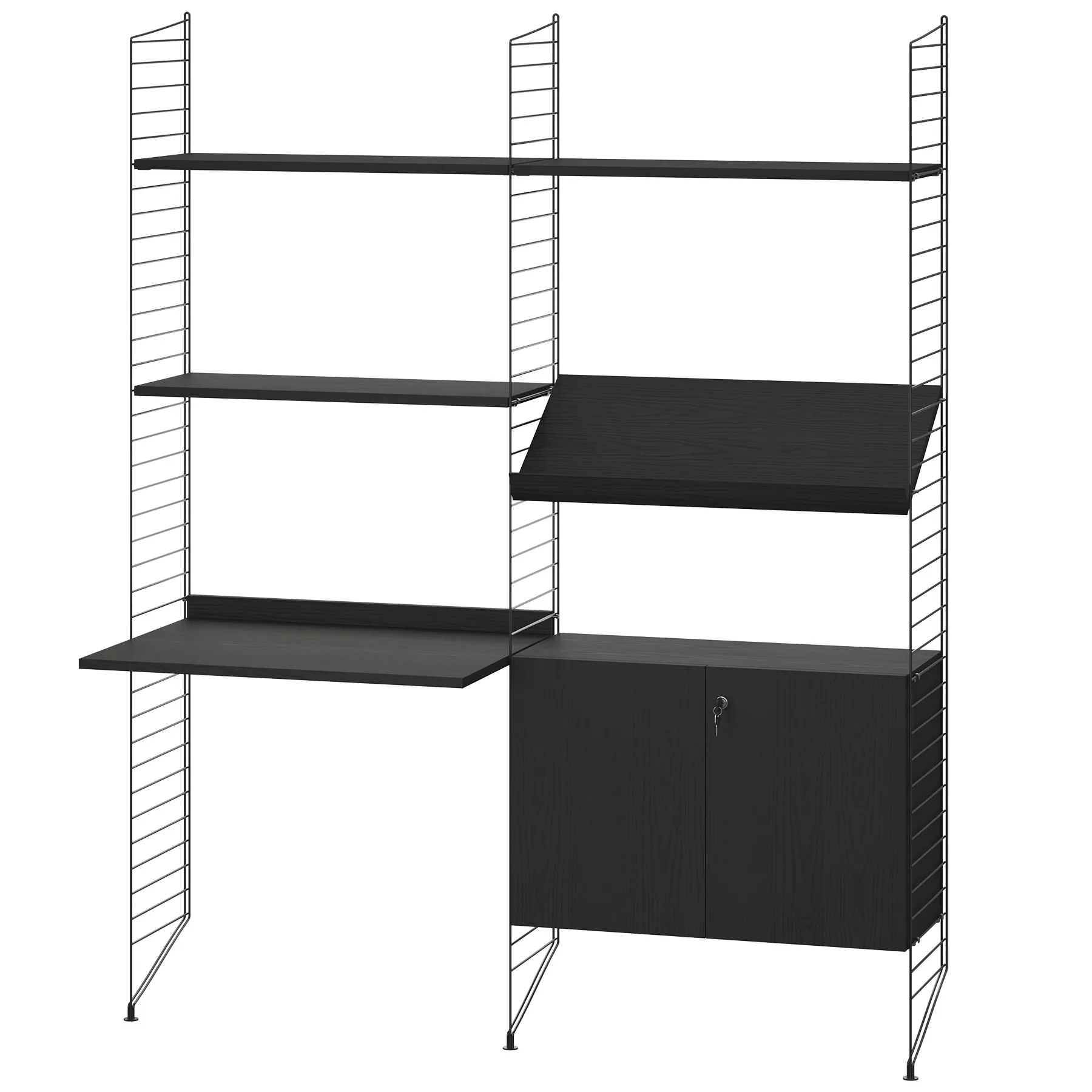 Yhdistelmää täydentää lukittava kaappi, jossa on push-open-ovet – oikeanpuoleisessa ovessa on lukko asiakirjojen ja henkilökohtaisten tavaroiden turvalliseen säilyttämiseen. Kuten muutkin String-järjestelmän osat, kokonaisuus on muokattavissa ja laajennettavissa tarpeiden muuttuessa.