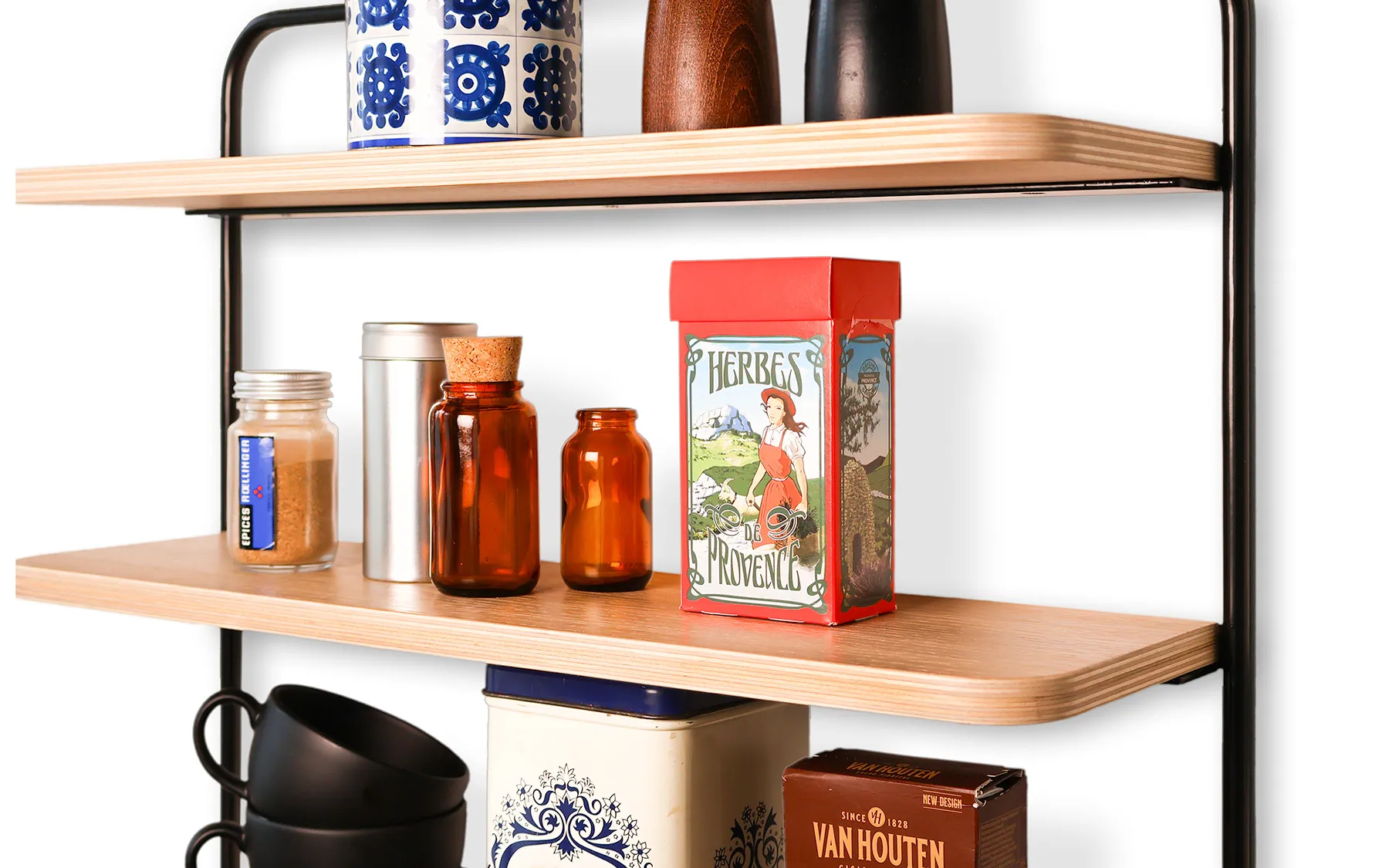 Hyllylevy valmistetaan ON2 Wood -sohvan tuotannosta ylijääneestä materiaalista ja yhdistetään valkoiseen tai mustaan lakattuun metallikehykseen. Seinähylly kiinnitetään piilokiinnikkeillä, jotka antavat muodon puhua puolestaan. Kestävä valinta, jolla on selkeä käyttötarkoitus – ja pieni yksityiskohta, joka tekee arjesta sujuvamman.