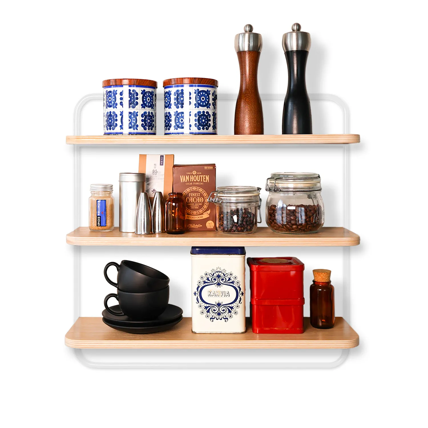 Hyllylevy valmistetaan ON2 Wood -sohvan tuotannosta ylijääneestä materiaalista ja yhdistetään valkoiseen tai mustaan lakattuun metallikehykseen. Seinähylly kiinnitetään piilokiinnikkeillä, jotka antavat muodon puhua puolestaan. Kestävä valinta, jolla on selkeä käyttötarkoitus – ja pieni yksityiskohta, joka tekee arjesta sujuvamman.
