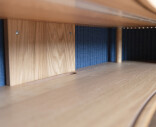 Audacious TV-taso toimii niin penkkinä kuin mediatasona. Tason takaosasta löytyy läpivienti johdoille, joten myös elektronisten laitteiden piilottaminen liukuovien taakse käy kätevästi. Eteisessä penkin päällä on mukava laittaa kengät jalkaan ja ovien taakse mahtuu ulkovaatteet ja pienet esineet. Kankainen liukuovi on vaihdettava.